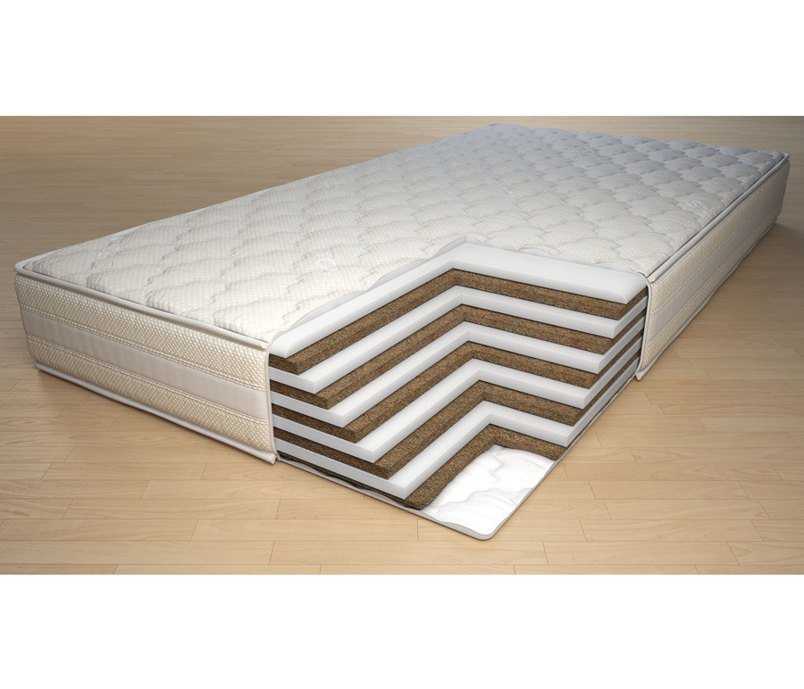 Беспружинный двусторонний матрас высокой степени жесткости, состоящий из чередующихся слоев пенополиуретана (2 см) и латексированной кокосовой койры (2 см). Пенополиуретан вспененный синтетический материал, традиционно используемый для изготовления матрасов и мебели. Обладает высокой воздухопроницаемостью, хорошим тепло- и влагообменом, гиппоаллергенен, выдерживает сильные и продолжительные нагрузки, придает матрасу мягкость. Латексированная кокосовая койра представляет собой натуральный растительный наполнитель из спрессованных волокон кокосового ореха, пропитанных специальным составом на основе натурального латекса. Это прочный, долговечный, воздухопроницаемый материал, придающий изделию упругость, необходимую жесткость. Материал гипоаллергенен и обладает антистатическим эффектом. Модель поставляется в несъемном чехле из трикотажа, стеганого на синтепоне, с 3D сеткой по периметру.