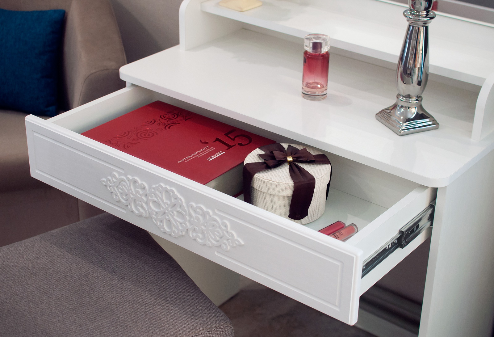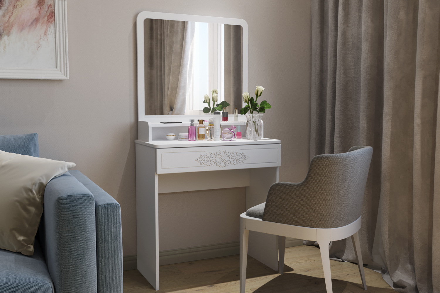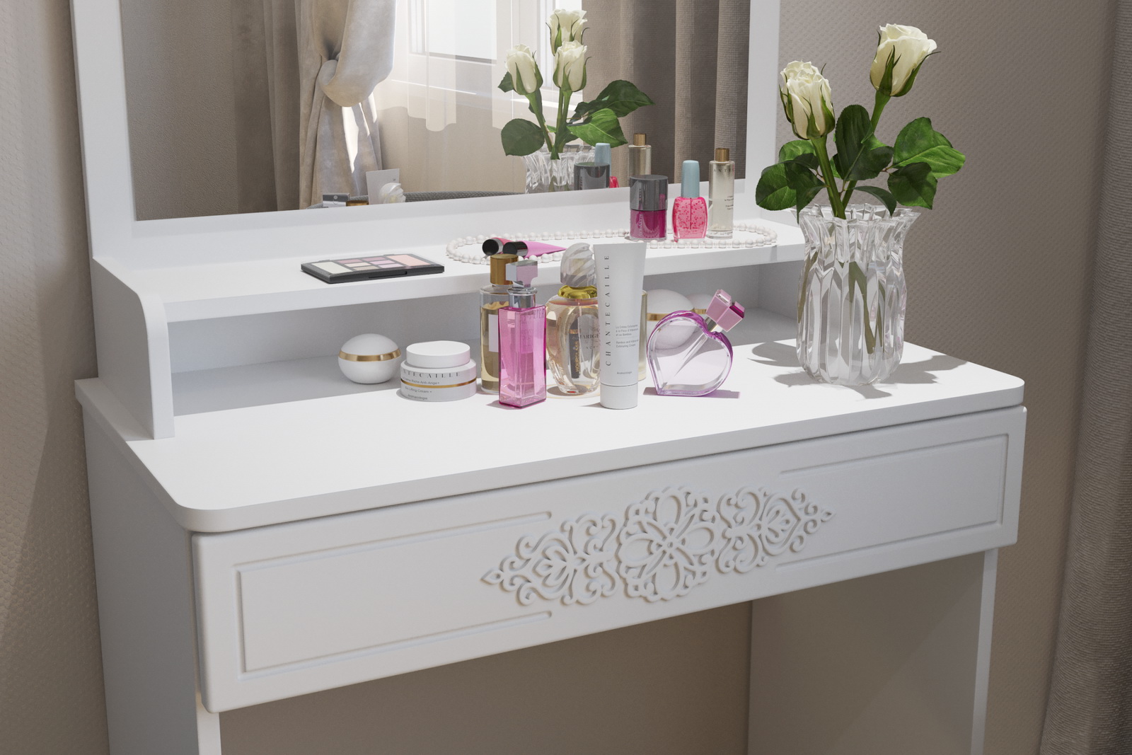 Туалетный столик – неотъемлемая часть спальни или женской комнаты. Каждая девочка, девушка или дама хочет иметь собственное пространство, свой уголок красоты, для того чтобы привести себя в порядок, нанести макияж, удобно и компактно расставить свою косметику и парфюмерию, аккуратно сложить украшения и аксессуары.