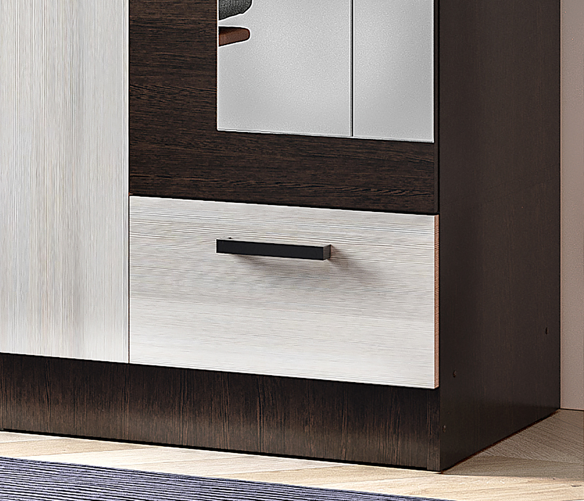 Распашной шкаф Адель разделен на две функциональные зоны: с одной стороны предусмотрена штанга для плечиков, а с другой — ряд полок для хранения вещей. Выдвижные ящики позволят аккуратно разместить белье и аксессуары. Фасады украшают два зеркала в полный рост.