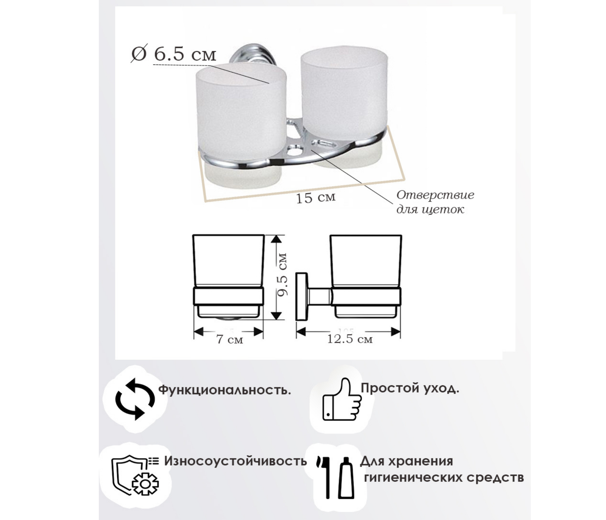 Изделие монтируется к стене при помощи надежного крепежа, выполненного из металлического сплава с хромированным покрытием. Держатель не поддается коррозии, не деформируется и не отрывается от поверхности. Матовый стакан стойкий к перепадам температуры и воздействию бытовой химии. Современный эргономичный дизайн держателя отлично сочетается с любыми аксессуарами в ванной комнате.