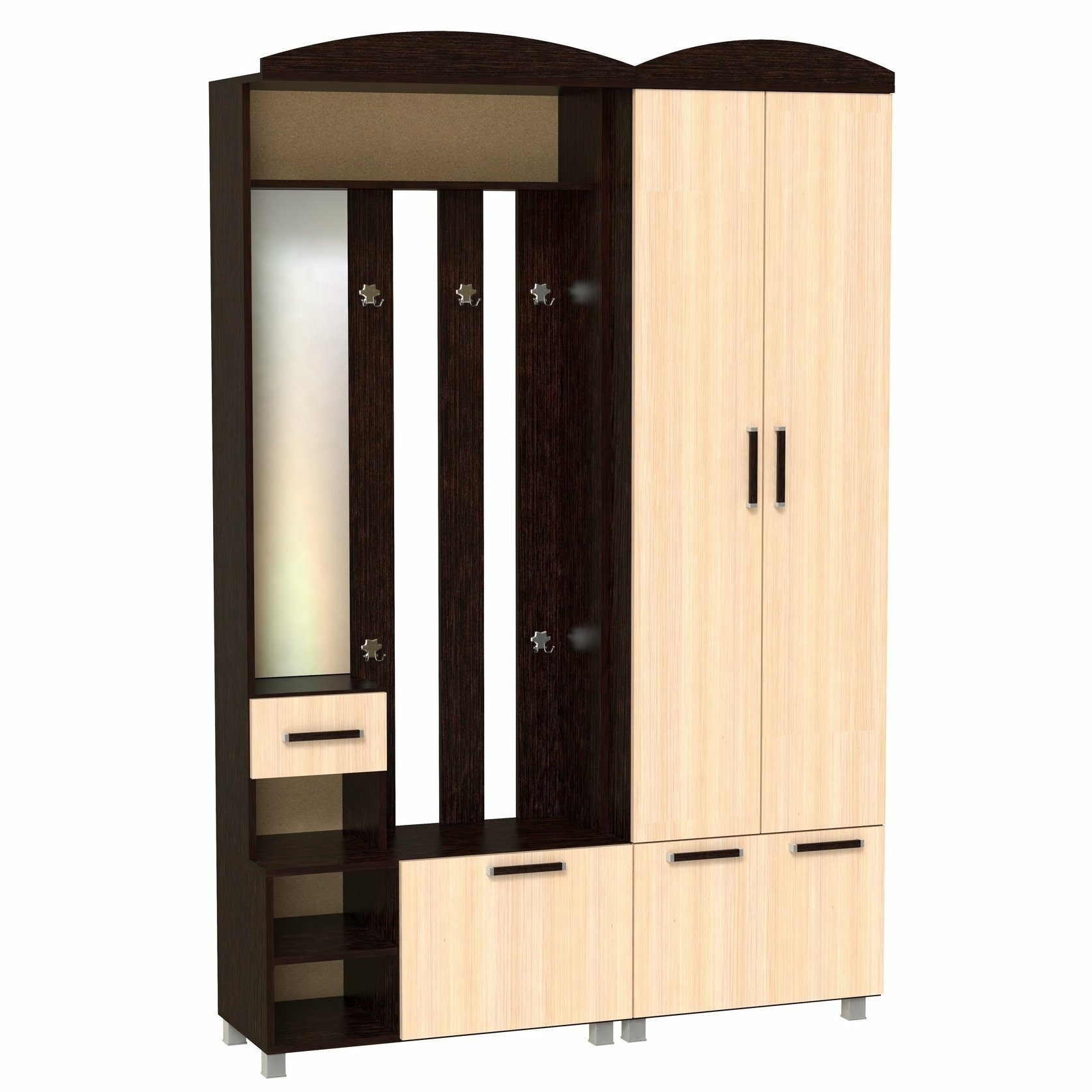 Корпус и фасады прихожей выполнен из Ламинированной ДСП высшего качества с насыщенным цветом. .Шириною 140 см., это небольшой комплект из двух модулей, тумбы-вешалки и шкафа. В шкафу две распашные двери и одна откидная. Во втором модуле небольшое, но высокое зеркальце над маленьким ящиком. Имеются три ниши рядом с откидной дверью. На вешалке пять двойных крючков. Прихожая Шк-7 самое лучшее решение и идеально подходит как для не больших помещений, так и для средних.¶