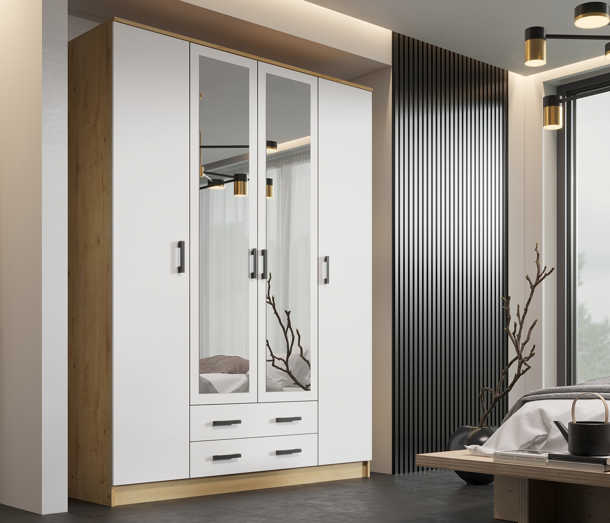 Большой распашной шкаф КВАДРО подарит вашему дому удобную систему хранения и визуально расширит пространство помещения, благодаря зеркалам на двух центральных дверцах. Функциональная и продуманная система хранения представлена двумя вертикальными секциями полок, парой широких выдвижных ящиков и отделением со штангой для вешалок.