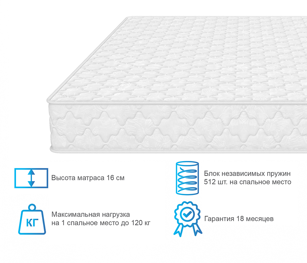 В основе матраса размещен блок независимых пружин, которые отлично адаптируются к контурам тела и обеспечивают оптимальную поддержку. Экопол(белый войлок, хлопок, полиэстер), входящий в состав матраса, придает ему дополнительную упругость и способствует равномерному распределению веса. По периметру матрас усилен коробом из плотной ортопедической пены, продлевающий срок службы матраса.