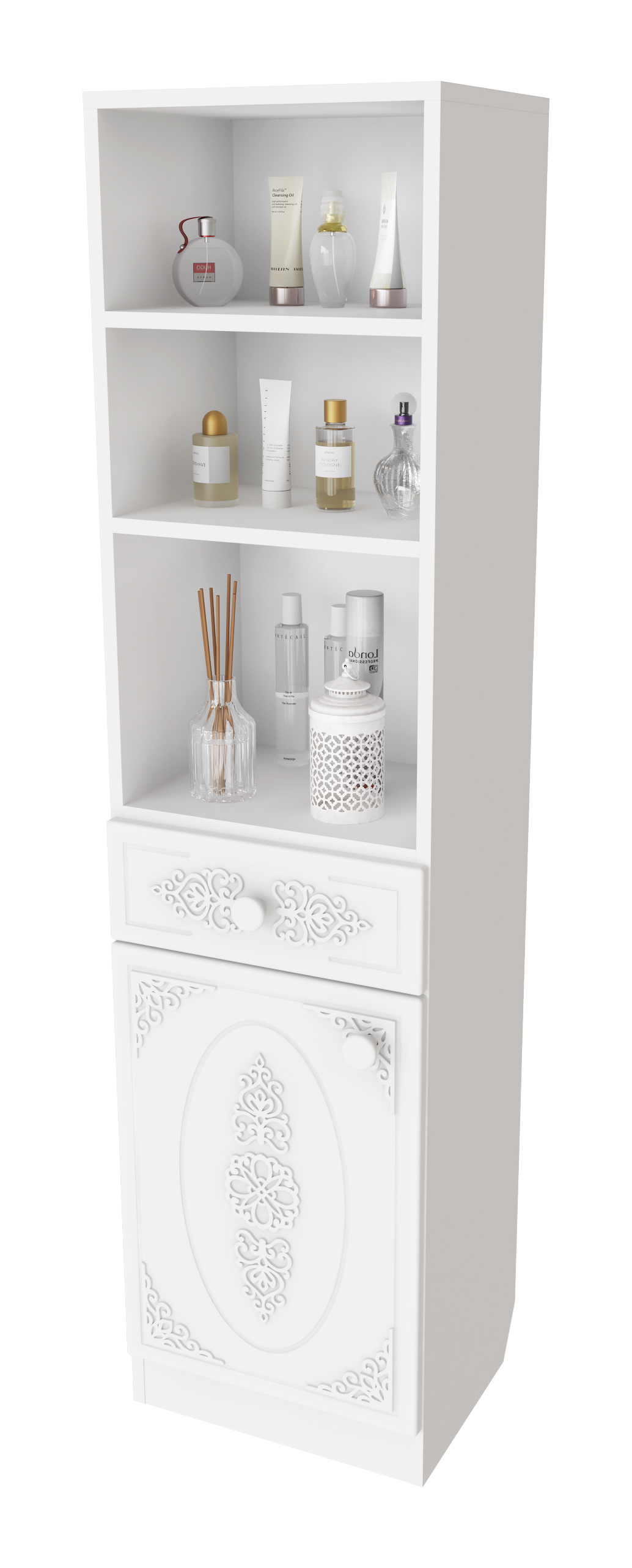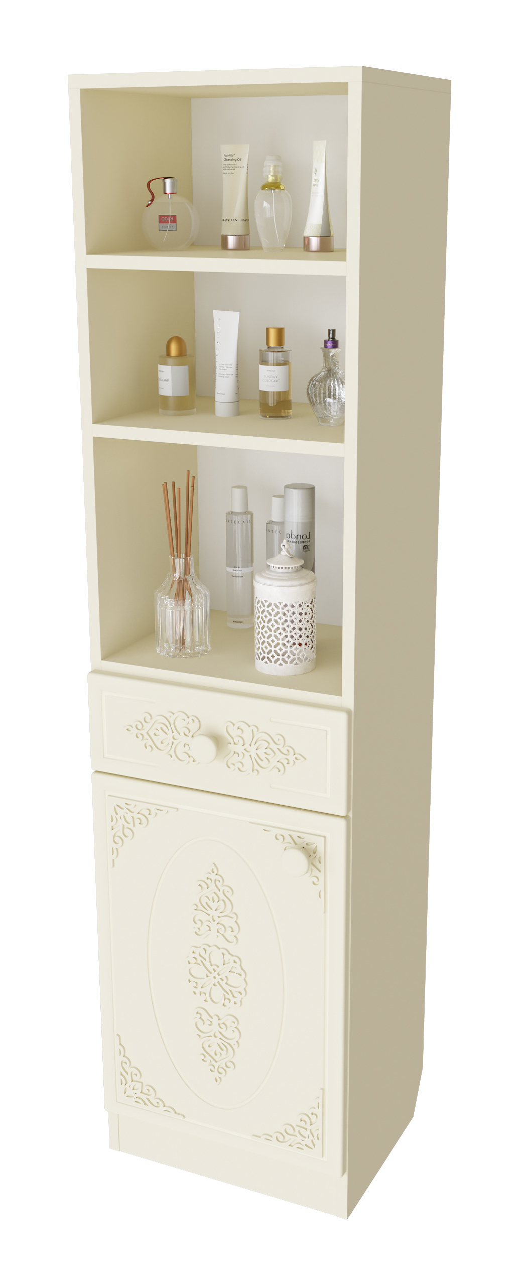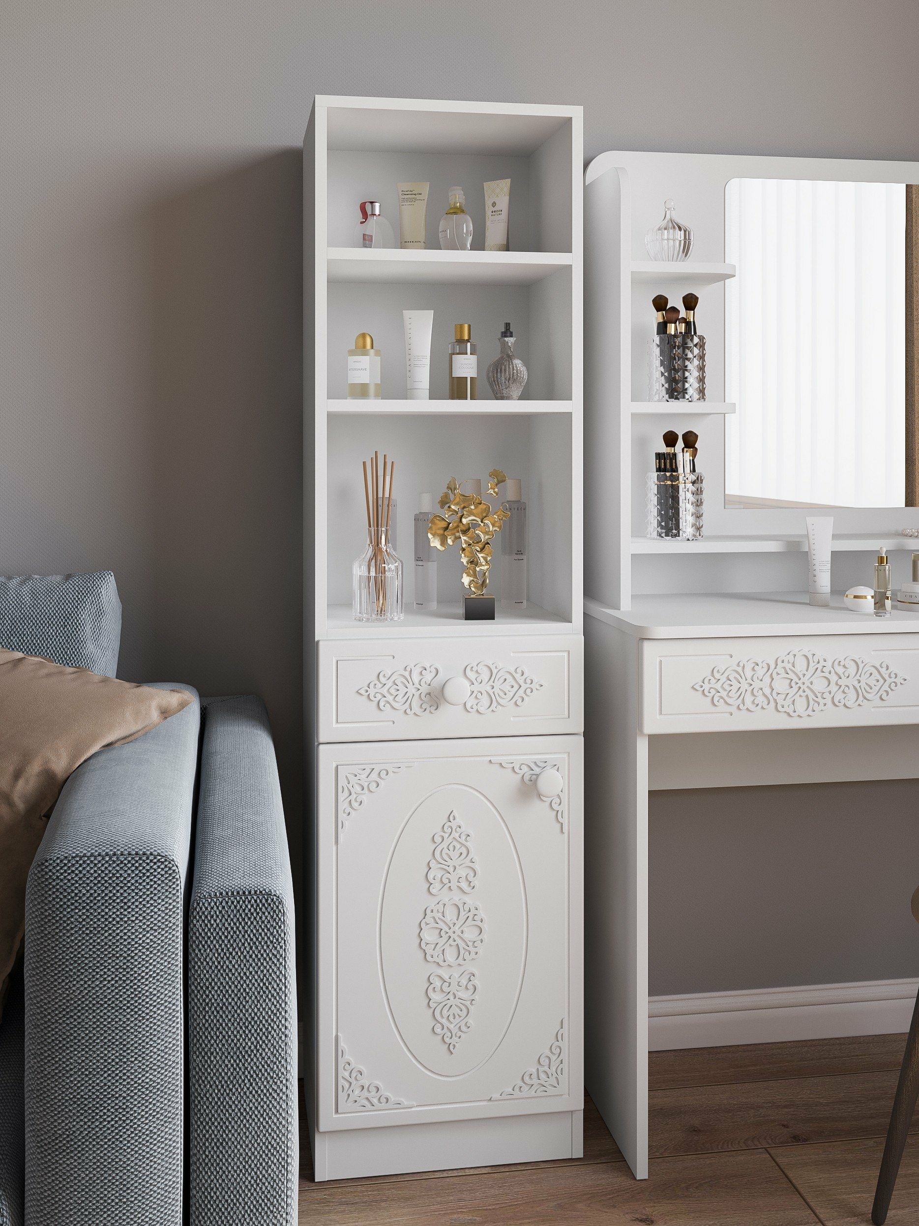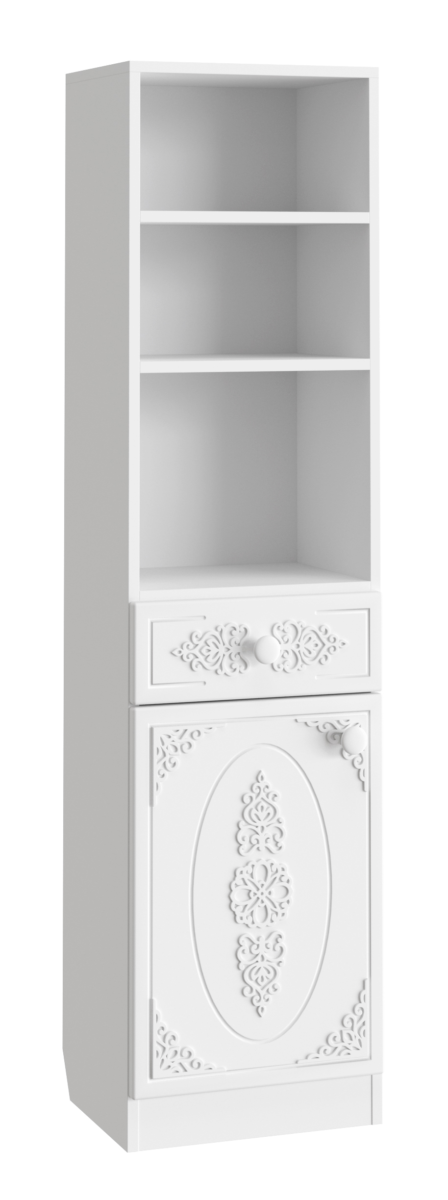 Шкаф АС-65 прекрасно дополнит ваш туалетный столик или письменный стол, создав много места для хранения книг, парфюмерии и разных аксессуаров. Фурнитура: петли с доводчиками, телескопические направляющие полного выдвижения. Модуль может быть собран в зеркальном варианте "левым" или "правым". Мебель изготовлена из качественной ламинированной ДСП 16 мм. В оформлении фасадов МДФ применяется уникальная технология нанесения объемного узора 3D.