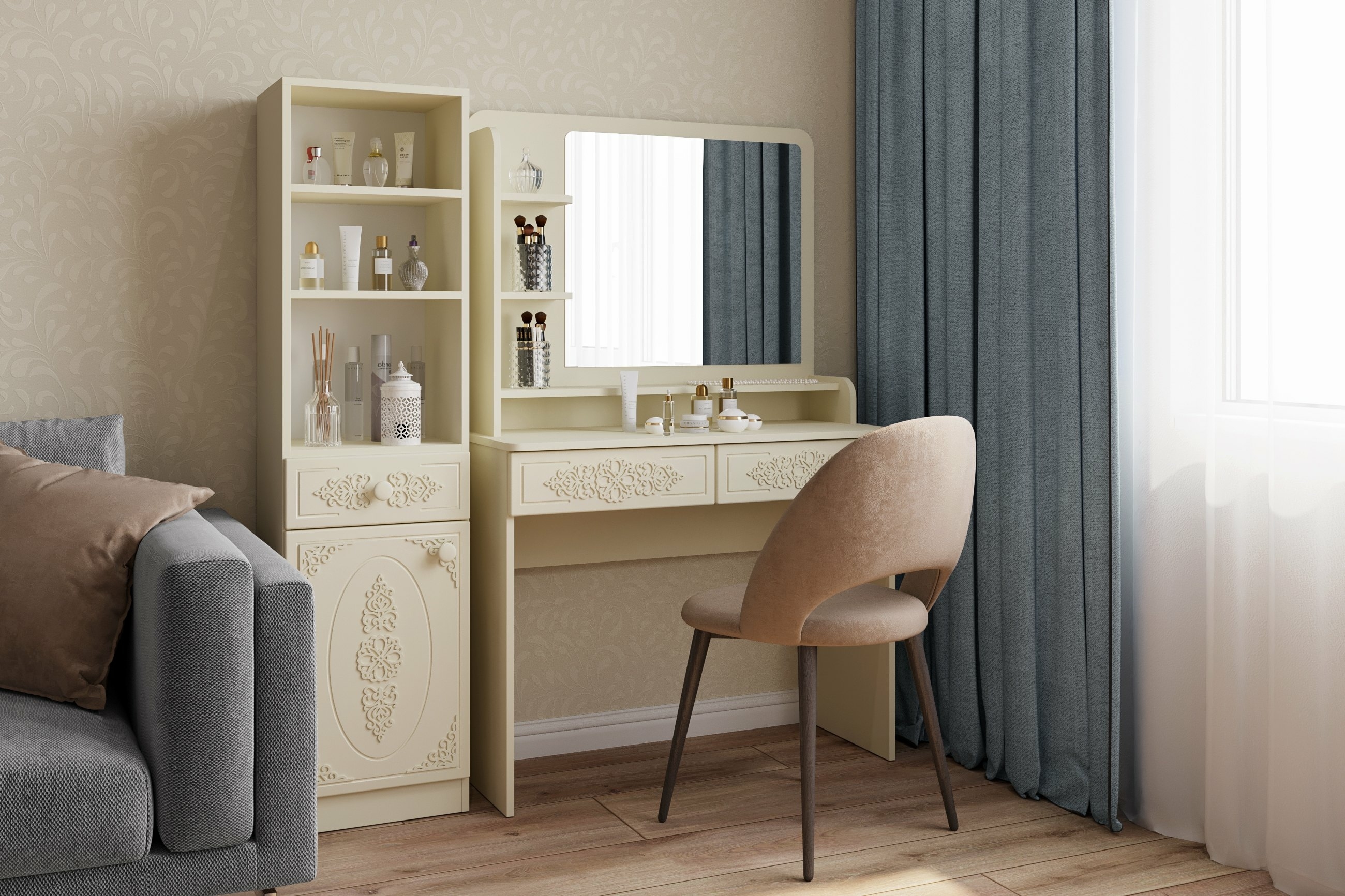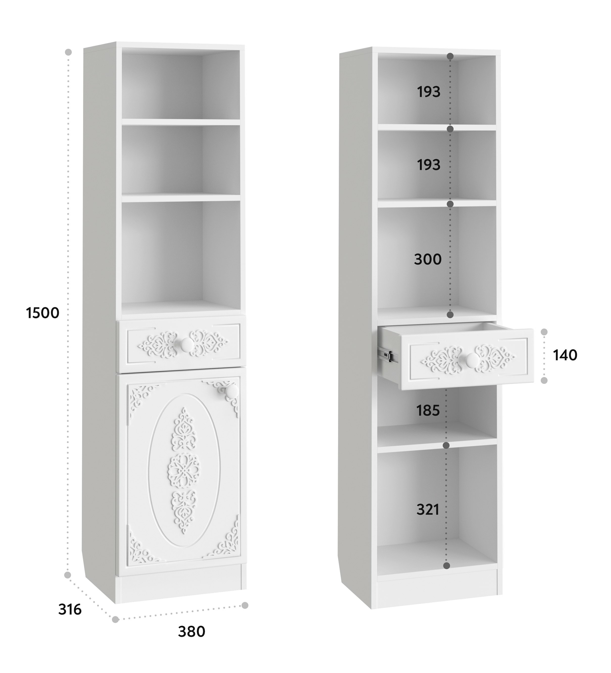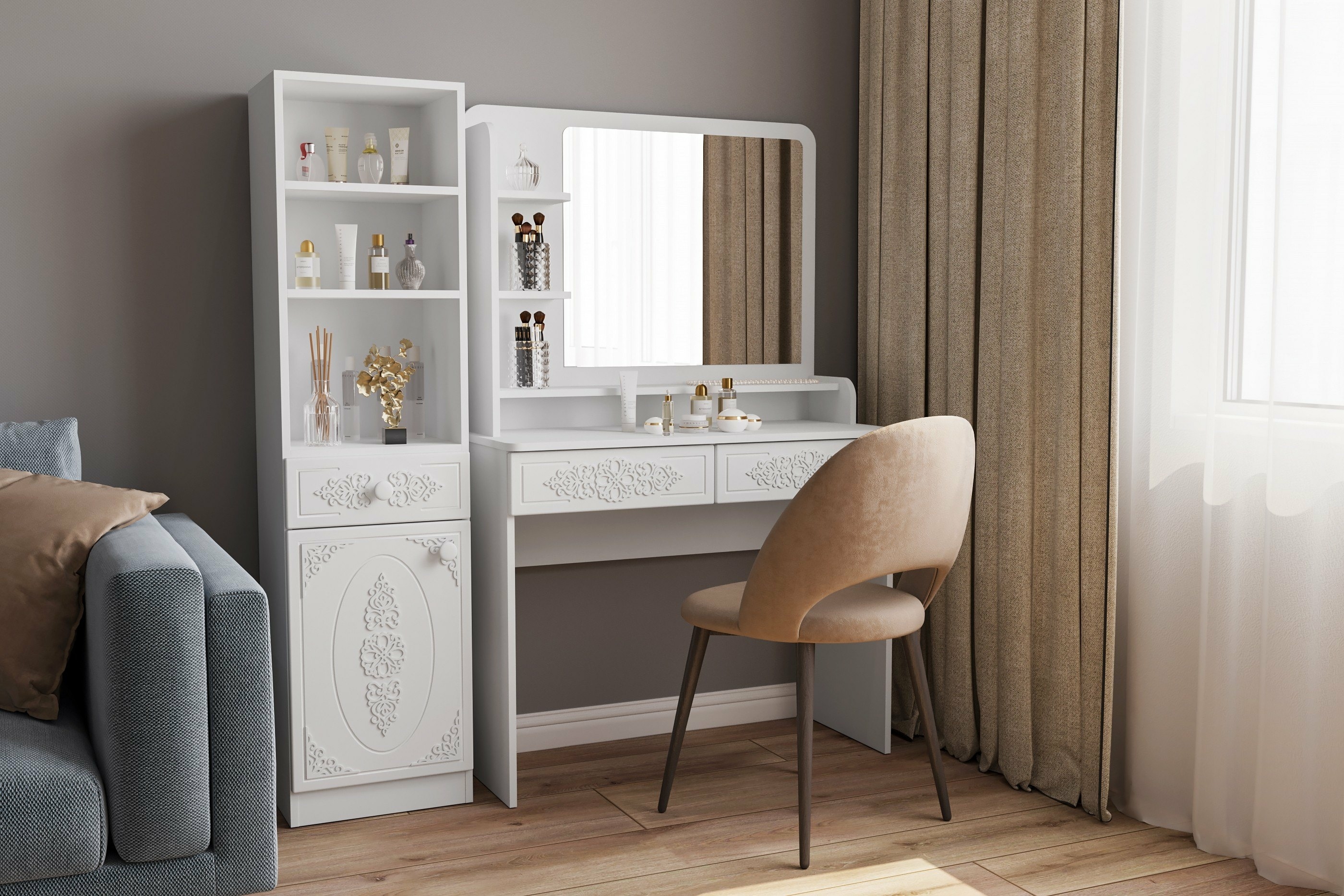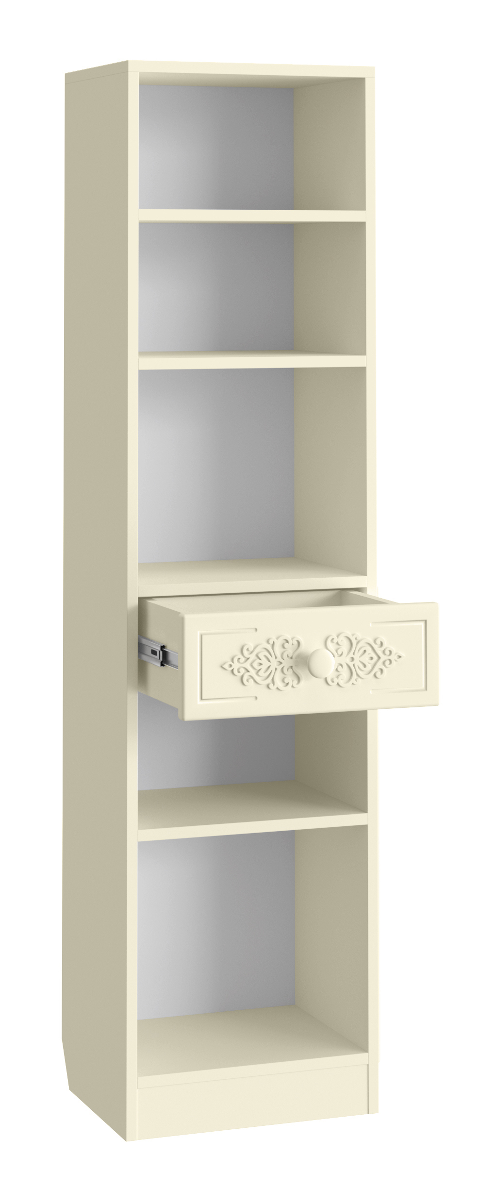 Шкаф АС-65 прекрасно дополнит ваш туалетный столик или письменный стол, создав много места для хранения книг, парфюмерии и разных аксессуаров. Фурнитура: петли с доводчиками, телескопические направляющие полного выдвижения. Модуль может быть собран в зеркальном варианте "левым" или "правым". Мебель изготовлена из качественной ламинированной ДСП 16 мм. В оформлении фасадов МДФ применяется уникальная технология нанесения объемного узора 3D.