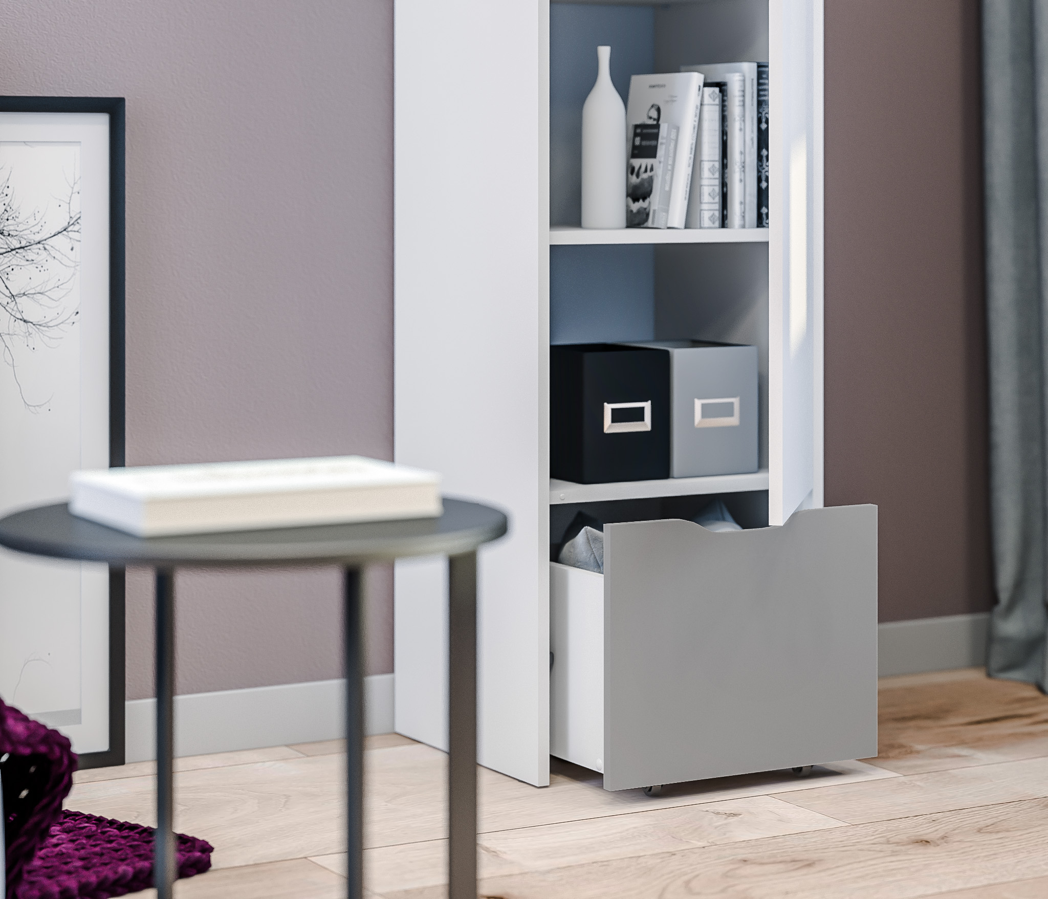 Корпус шкафа выполнен из прочного ламинированного ДСП, отделка в цвете «Белый альпийский». Материал фасадных поверхностей – ЛДСП в цветах отделки «Белый альпийский» и «Серый перламутровый». Вся мебель коллекции выполнена в лаконичном дизайне, без лишнего декора и безопасна в использовании.