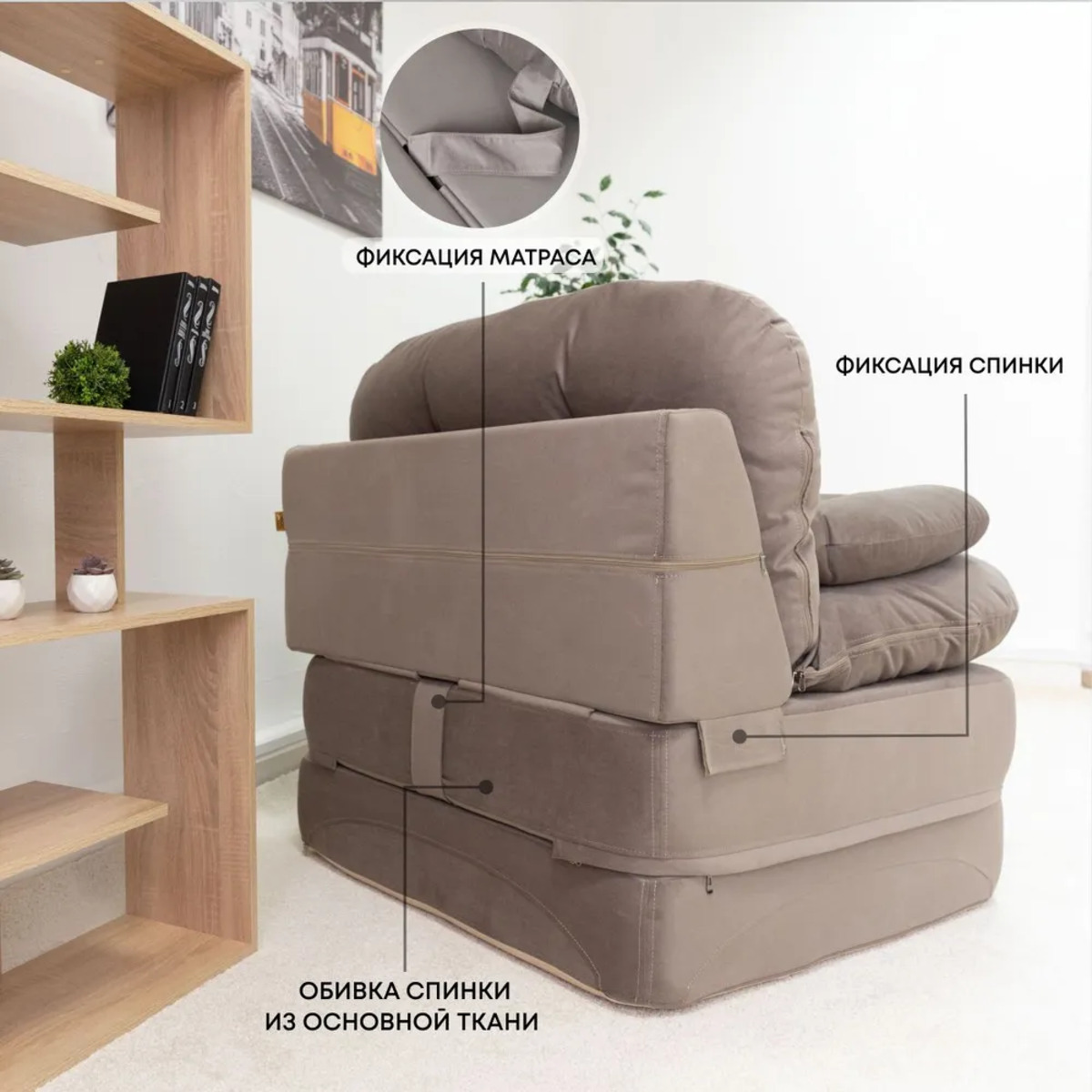 Кресло-кровать изготовлено из износостойкого велюра, который имеет 50 000 циклов по мартиндейлу (по стандарту необходимо 20 000). Наружный чехол матраса легко снимается для чистки. Обивка выполнена из мягкой и приятной на ощупь ткани, которая легко чистится и не выцветает со временем. Это кресло-трансформер легко складывается и раскладывается, что позволяет быстро и удобно изменять его форму в зависимости от ваших потребностей. В сложенном виде оно занимает минимум места, а в разложенном превращается в полноценное спальное место. Это особенно полезно для небольших квартир или домов, где каждый метр пространства имеет значение. Для раскладывания диванчика необходимо сделать несколько простых операций: отодвинуть его от стены, отстегнуть “липучки”-фиксаторы, опустить спинку, расстегнуть “молнии” в средней части основания и разложить.