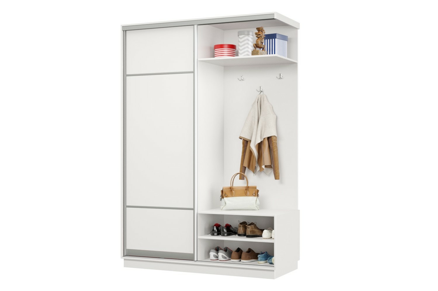 В прихожей используется одна дверь, которая перемещается по однополосному треку вправо или влево, закрывая или открывая каждую из двух частей шкафа.