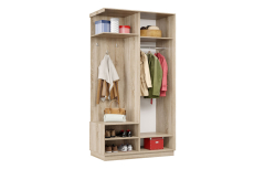 Дверь делит шкаф на 2 равные части: отделение для верхней одежды и отделение с полками и крючками.