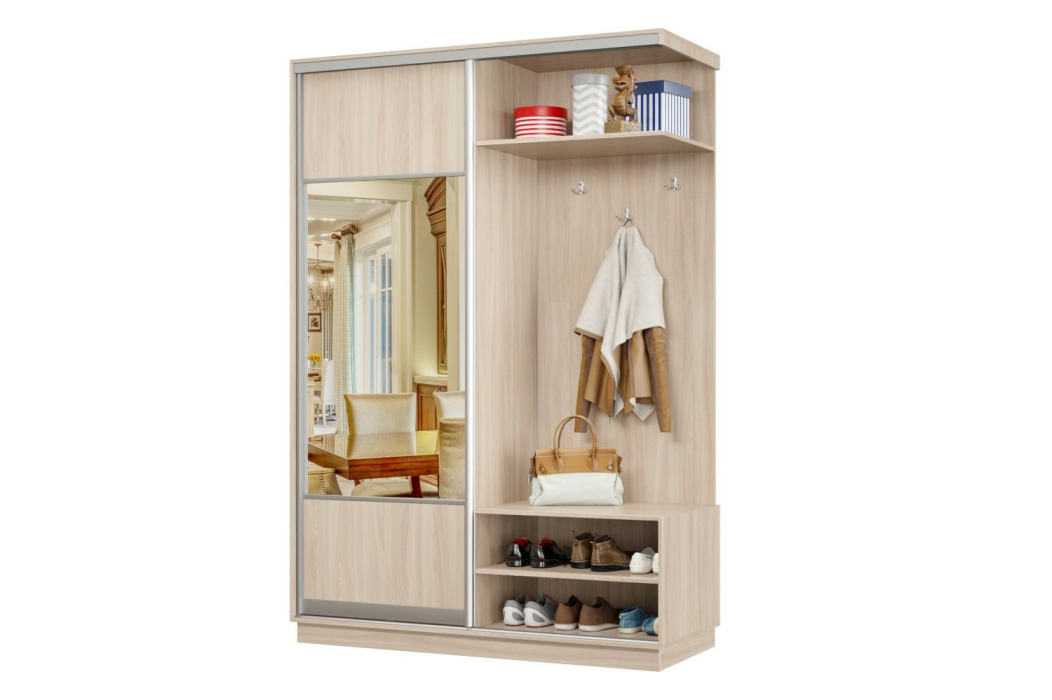 В прихожей используется одна дверь, которая перемещается по однополосному треку вправо или влево, закрывая или открывая каждую из двух частей шкафа.