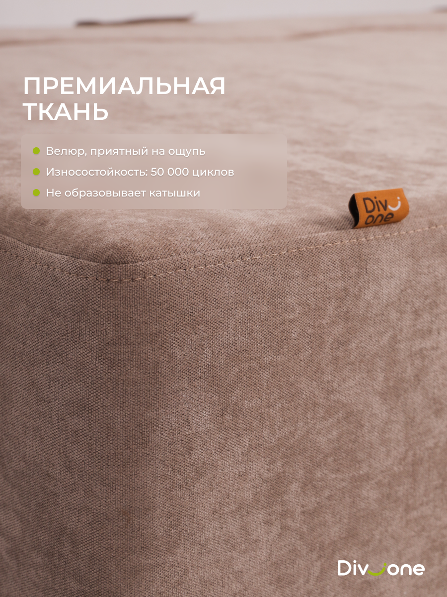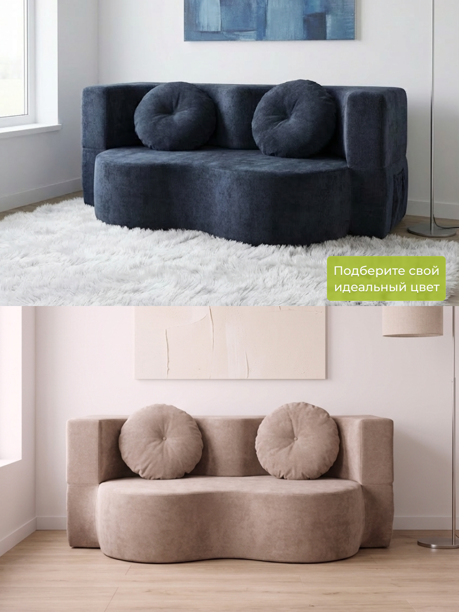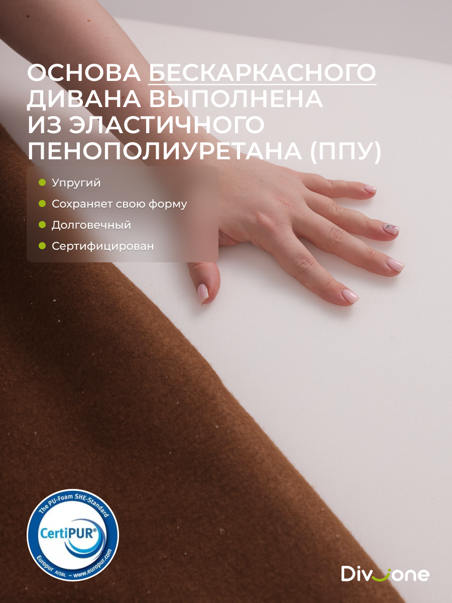 Наши бескаркасные диваны для городской квартиры и загородной дачи изготовлены из материалов высокого качества. Основа выполнена из гипоаллергененного ППУ (Пенополиуретан) толщиной 40 сантиметров, что обеспечивает упругость. Велюр имеет износостойкость — 50 000 циклов по тесту Мартиндейла, что более чем вдвое превышает стандартные требования. Обивка выполнена из качественных материалов, которые легко чистятся и не выцветают со временем. Наполнение декоративых подушек представляет собой смесь упругой поролоновой крошки и воздушного синтепуха. Такой состав препятствует быстрой усадке, эффективно поддерживает первозданную форму изделия и продлевает его срок службы на долгие годы. Таким образом, долговечность и сохранение превосходного внешнего вида гарантированы. Диванчик отлично подходит для сна благодаря своему ортопедическому эффекту.