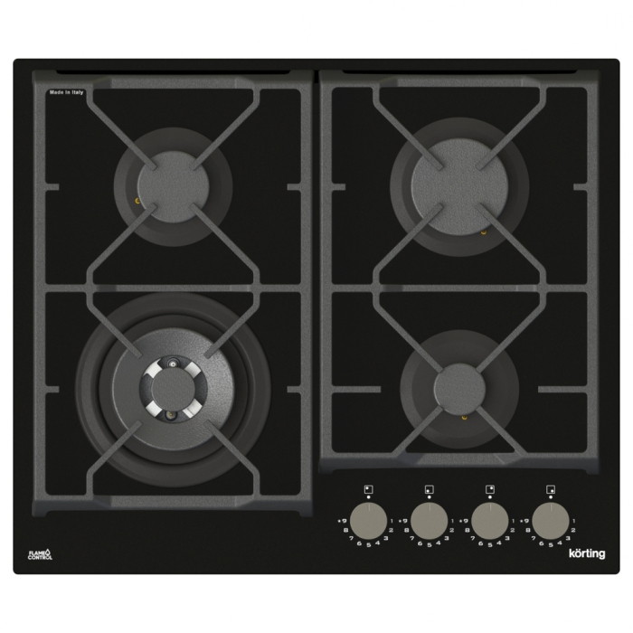 Газовая варочная панель из закаленного стекла шириной 60 см, 4 высокоэффективные конфорки, WOK-сверхмощная конфорка с тройным рядом пламени, технология точной регулировки мощности пламени в 9-ти положениях Flame Control, автоматический электроподжиг, газ-контроль каждой конфорки, переднее расположение поворотных регуляторов, металлические регуляторы, цельные чугунные решетки, в комплекте - подставка WOK, цвет - черное стекло.