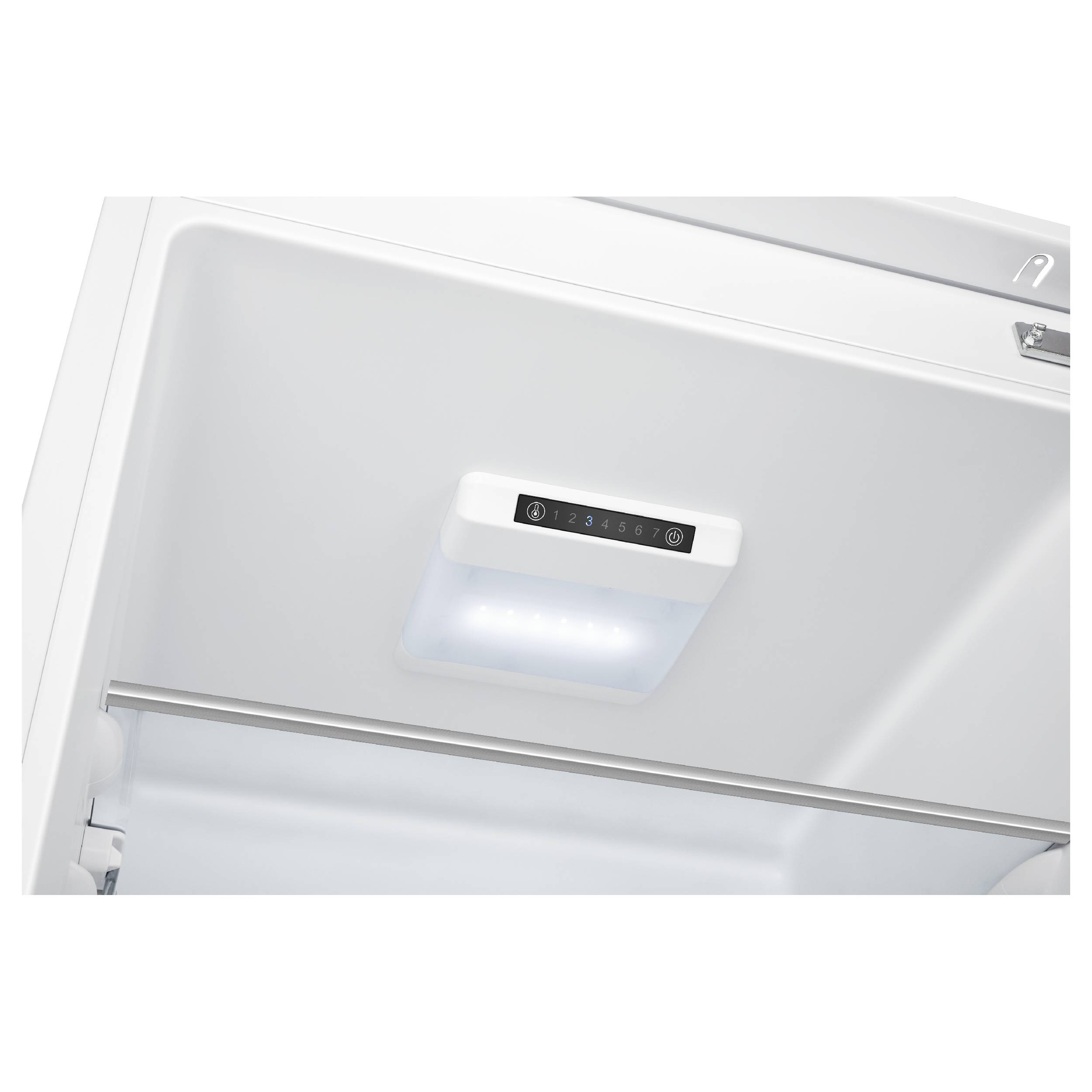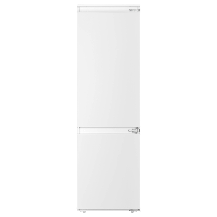 Встраиваемый холодильник-морозильник с функцией No Frost морозильного отделения, класс энергопотребления: A+, электронное управление с LED индикацией, динамическое охлаждение камеры Fresh Air Cooling, 4 стеклянные полки с хромированной отделкой в х/о, 3 полноразмерные прозрачные дверные полки с хромированной отделкой, большой ящик для овощей и фруктов, 2 подставки для яиц, LED освещение х/о. Количество компрессоров: 1. Мощность замораживания (кг/24 ч): 3,0. Длительность сохранения холода при отключении электроэнергии (ч): 11. Перенавешиваемые двери, слайдерное крепление. Объем нетто холодильного отделения, л: 182, объем нетто морозильного отделения, л: 56, уровень шума 41 дБ, 1769х540х540 мм.