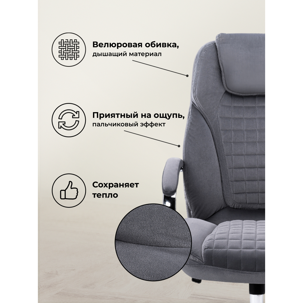 Высота подлокотников: 70- 78 см. Материал каркаса - Хромированный металл; Материал сиденья - Велюр; Материал ножек - Хромированный металл; Материал обивки - Велюр; Цвет каркаса - Хромированный металл; Цвет сиденья - Серый; Цвет ножек - Хромированный металл; Цвет обивки - Серый; Ширина - 68; Глубина - 73; Высота - 117; Ширина сиденья - 56; Глубина сиденья - 50; Высота сиденья - 49; Высота сиденья максимальная - 57; Высота максимальная - 125.