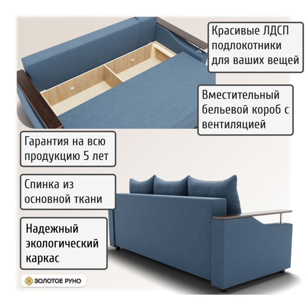 Достоинства: ровное спальное место, лёгкость процесса трансформации дивана, ёмкий бельевой ящик, прочность механизма, долговечность конструкции.