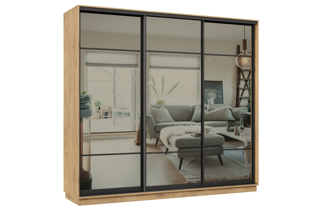 Шкаф-купе Премьер 58 (11ЗГ;11ЗГ;11ЗГ) фасады зеркало графит/трёхдверный/Профиль чёрный муар (Бунратти)