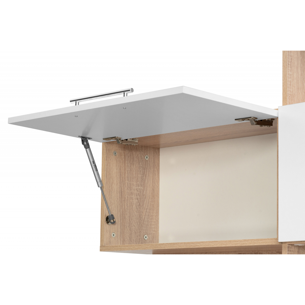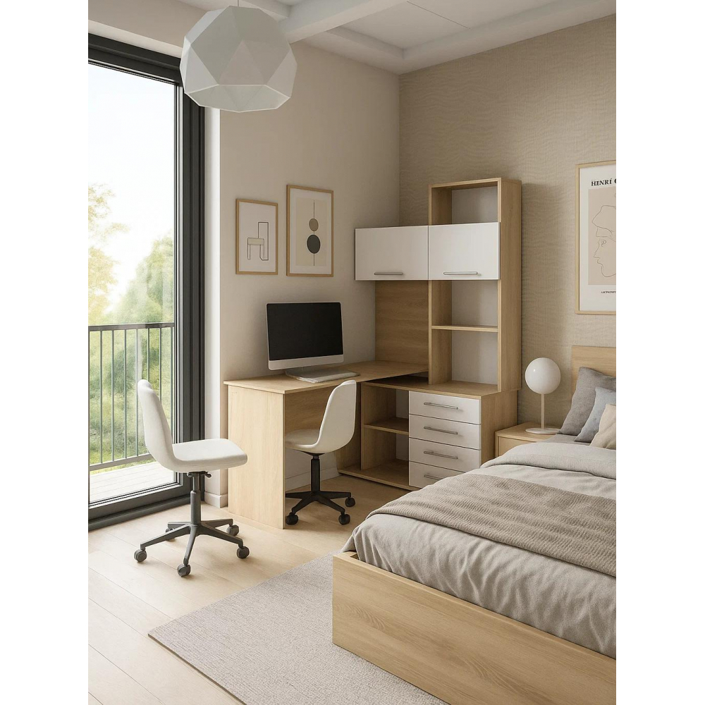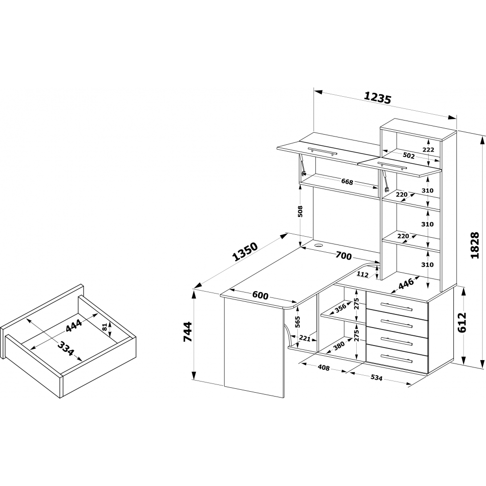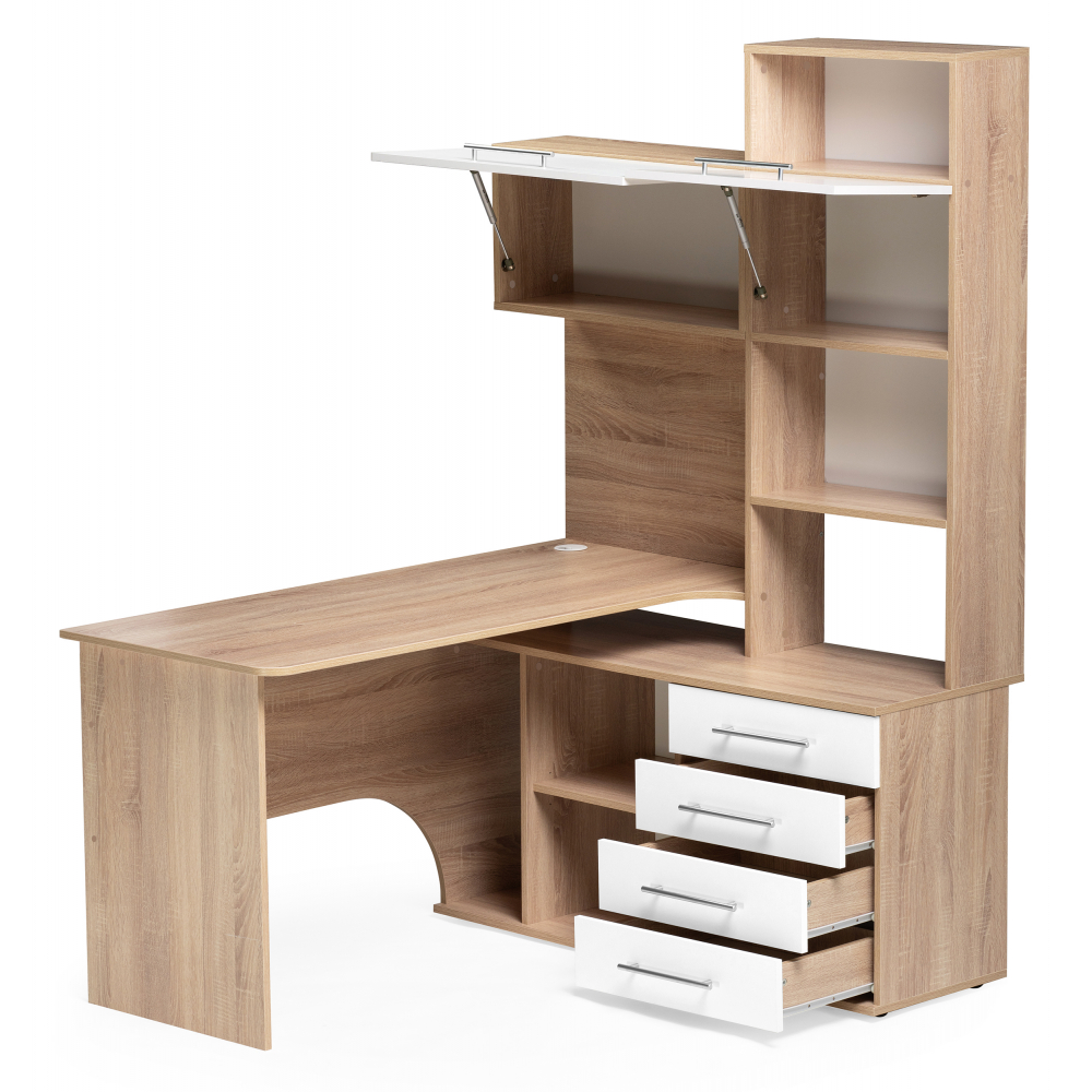 Стол КСТ-14П правый; ЛДСП. 4 ящика, вместительные полки для хорошего количества книг, место под миниатюрный ПК. Дверцы у полок оснащены небольшим газлифтом. Нижняя полка около ящиков съёмная, если есть необходимость в месте под большой ПК
