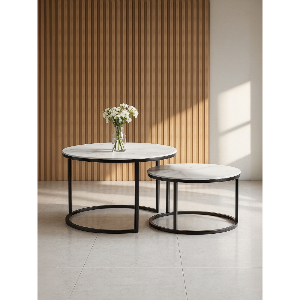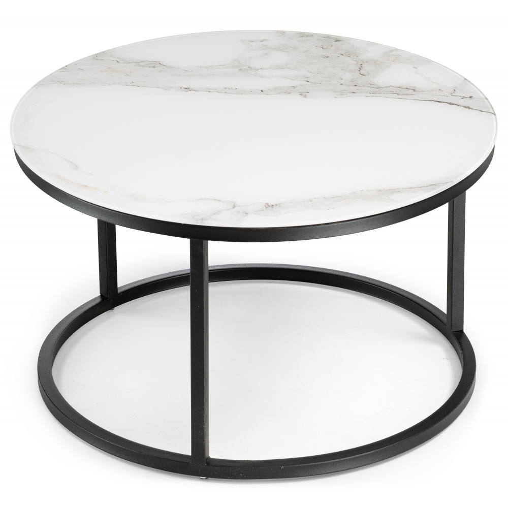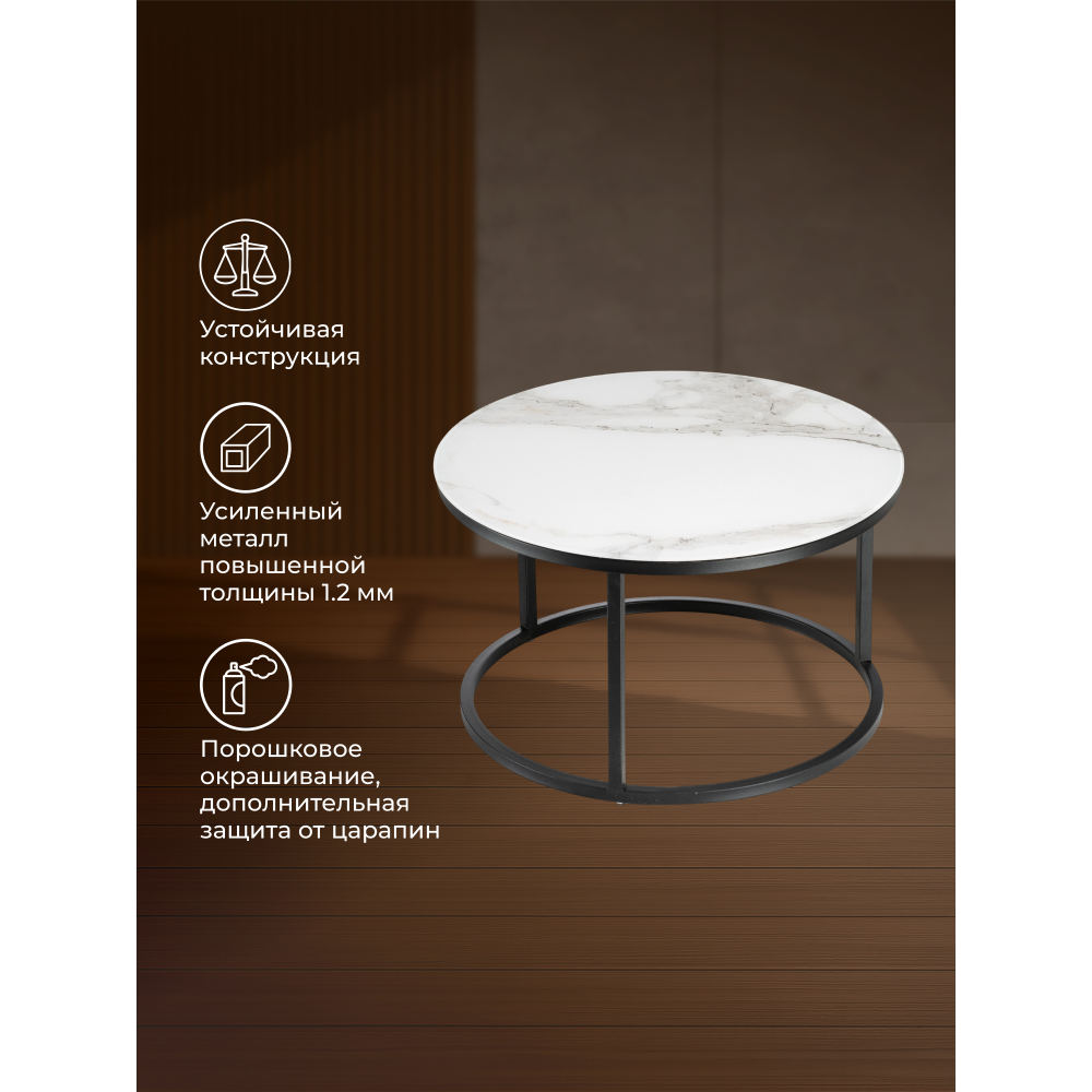 Журнальный стол Плумерия белый мрамор / черный; Металл. Экономия места - столики можно задвинуть один под другой. Толщина закалённого стекла - 4мм, под стеклом ЛДСП - 16мм.