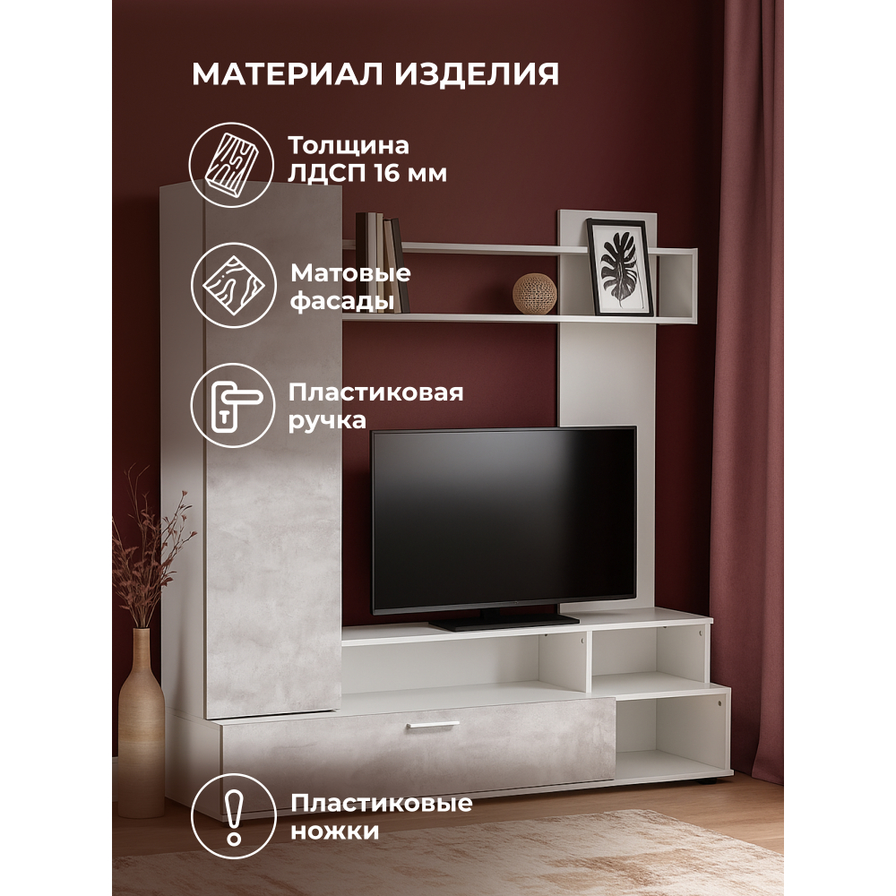Изготовленная из ЛДСП, эта гостиная состоит из ниши под ТВ размером 111 * 72 см, которая позволяет разместить телевизор до 43 дюймов. Эта ниша является идеальным местом для просмотра ваших любимых фильмов и шоу.