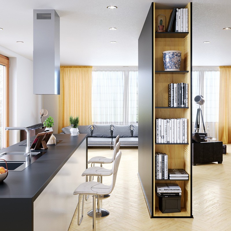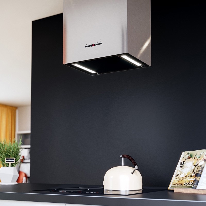• Дизайнерская островная вытяжка в форме прямоугольного параллелепипеда становится центральным вертикальным элементом, связывающим дизайн кухни воедино. Стильное сочетание нержавеющей стали «сатин» и блеска закаленного стекла создают ощущение легкости прочной конструкции. Декоративный стеклянный люк скрывает алюминиевый, жироулавливающий фильтр, придавая завершенность композиции