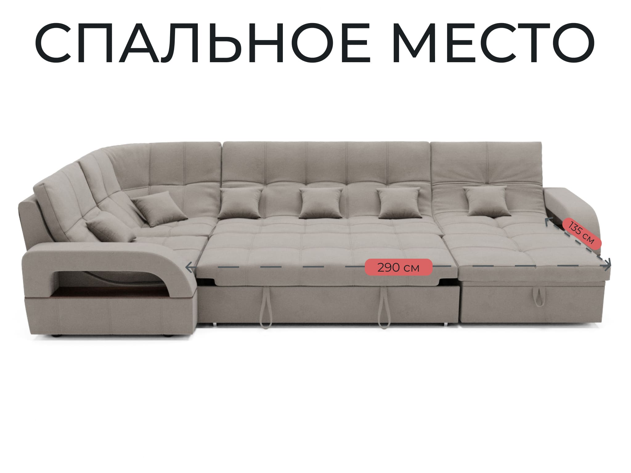 Спальное место имеет ширину 135 см и длину 290 см. Он предназначен для двух человек и имеет глубину сиденья 65 см. Максимальная нагрузка на диван составляет 280 кг.