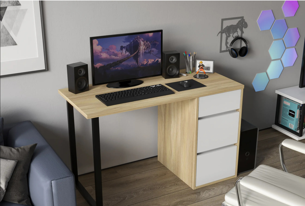 Стол письменный С-401 позволит создать комфортное и стильное рабочее пространство в офисе или домашнем кабинете. Стол С-401 можно использовать в качестве маникюрного стола. Стол имеет прочную стальную опору и тумбу с тремя выдвижными ящиками. Столешница изготовлена из ЛДСП 25 мм. Стол может быть собран в зеркальном варианте «правым» или «левым». Фурнитура: телескопический направляющие полного выдвижения без доводчиков, опора металл.