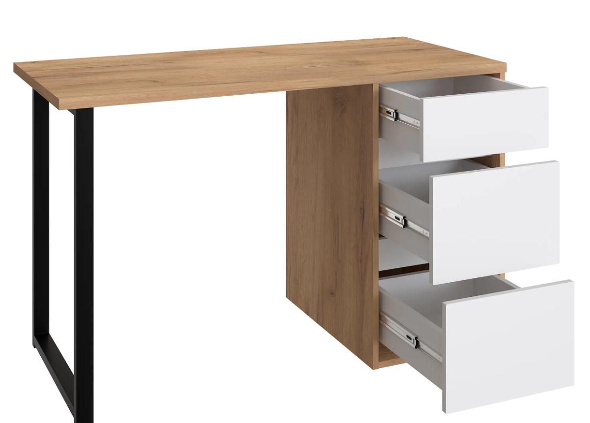 Стол письменный С-401 позволит создать комфортное и стильное рабочее пространство в офисе или домашнем кабинете. Стол С-401 можно использовать в качестве маникюрного стола. Стол имеет прочную стальную опору и тумбу с тремя выдвижными ящиками. Столешница изготовлена из ЛДСП 25 мм. Стол может быть собран в зеркальном варианте «правым» или «левым». Фурнитура: телескопический направляющие полного выдвижения без доводчиков, опора металл.