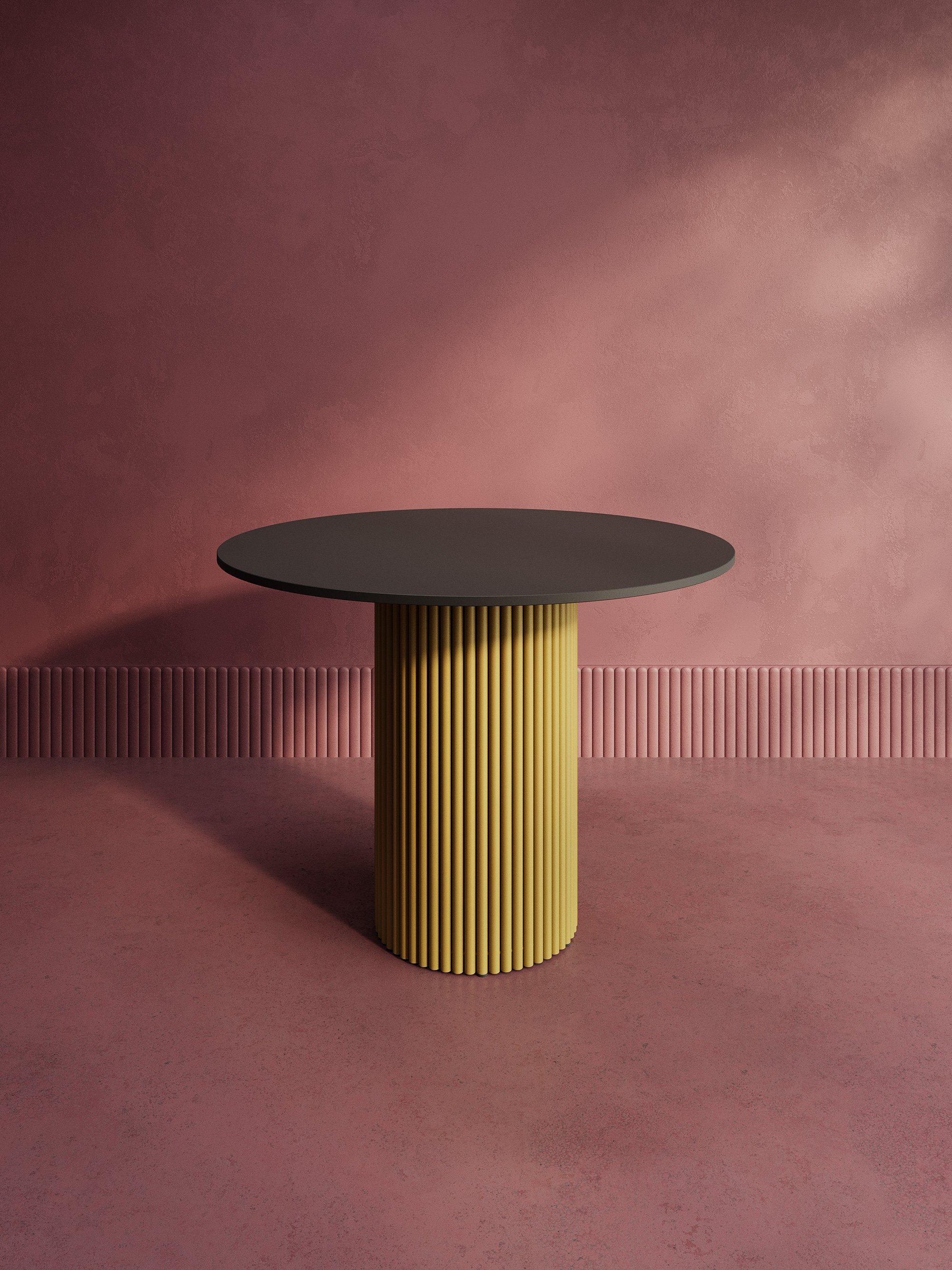 Дизайнерский круглый стол с металлическим трубчатым подстольем. Диаметр подстолья D400 мм. Столешница ЛДСП 16мм, диаметр D1000 мм. Стандартный вариант - матовая порошковая окраска в золотой, чёрный или белый цвет. На заказ возможно изготовление столешницы ЛДСП в индивидуальном цвете и размере под заказ.
