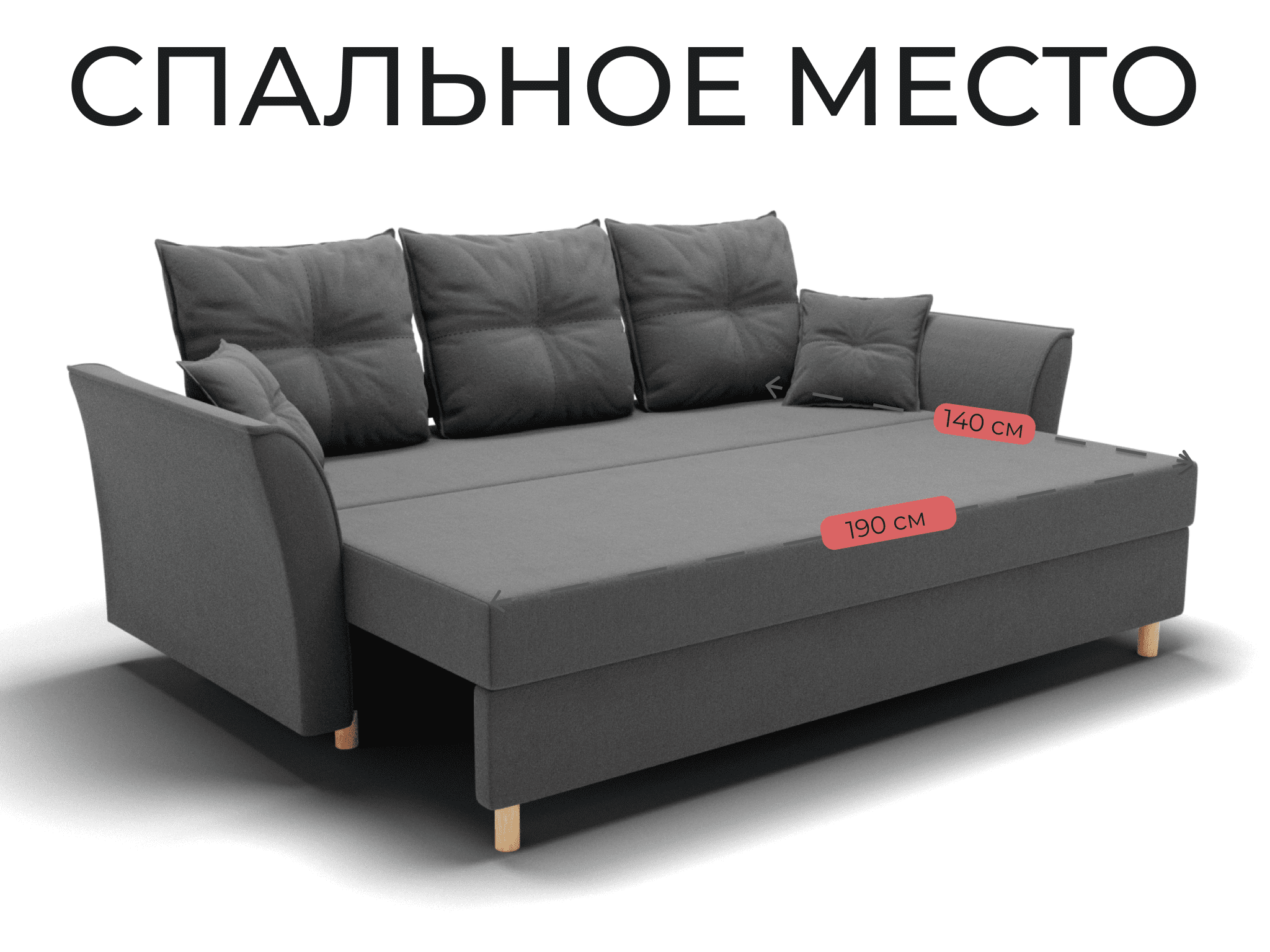 Спальное место: ширина - 140 см, длина - 190 см. Максимальная нагрузка - 250 кг.