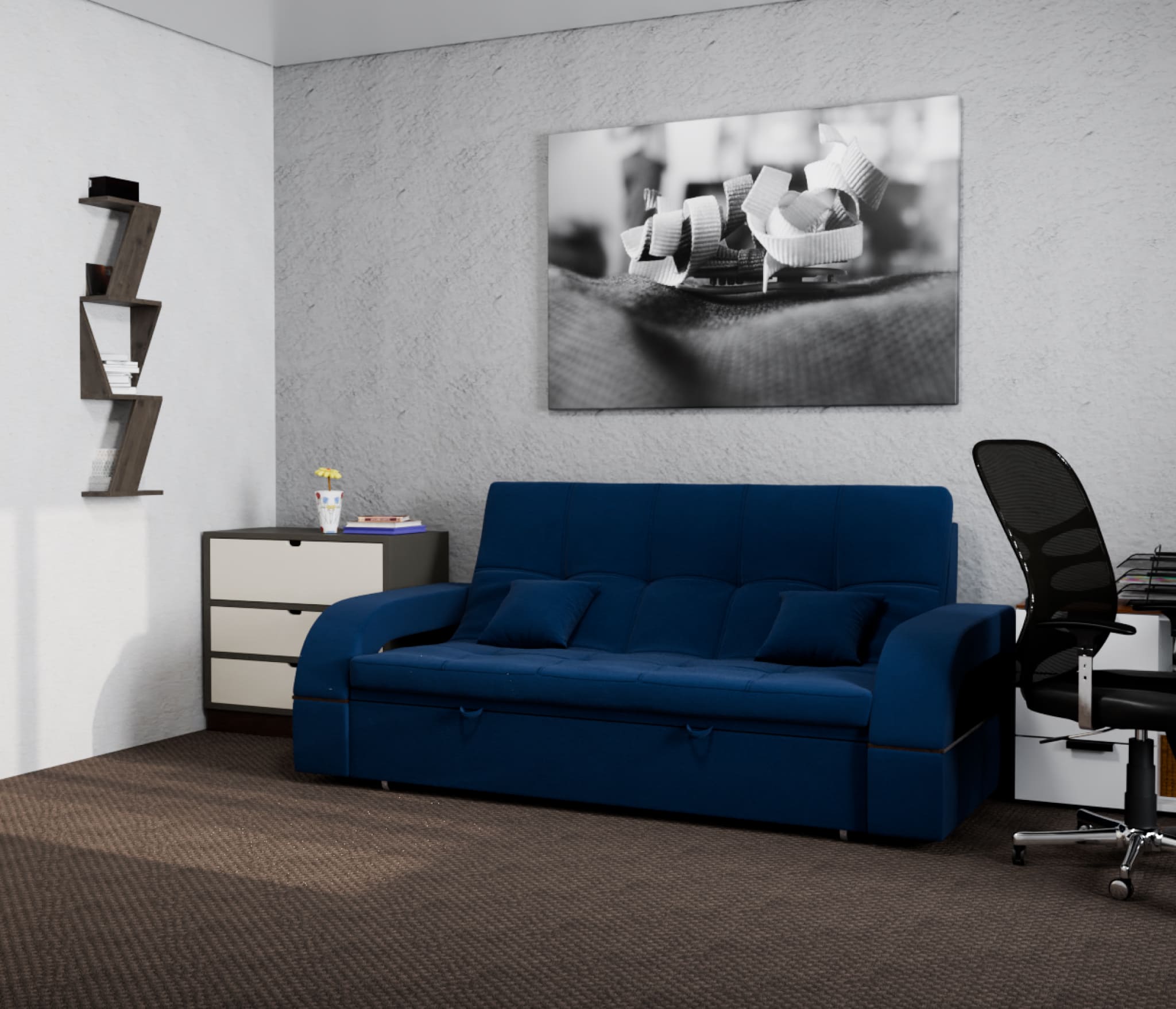 Спальное место имеет ширину 135 см и длину 185 см. Он предназначен для двух человек и имеет глубину сиденья 65 см. Максимальная нагрузка на диван составляет 280 кг.