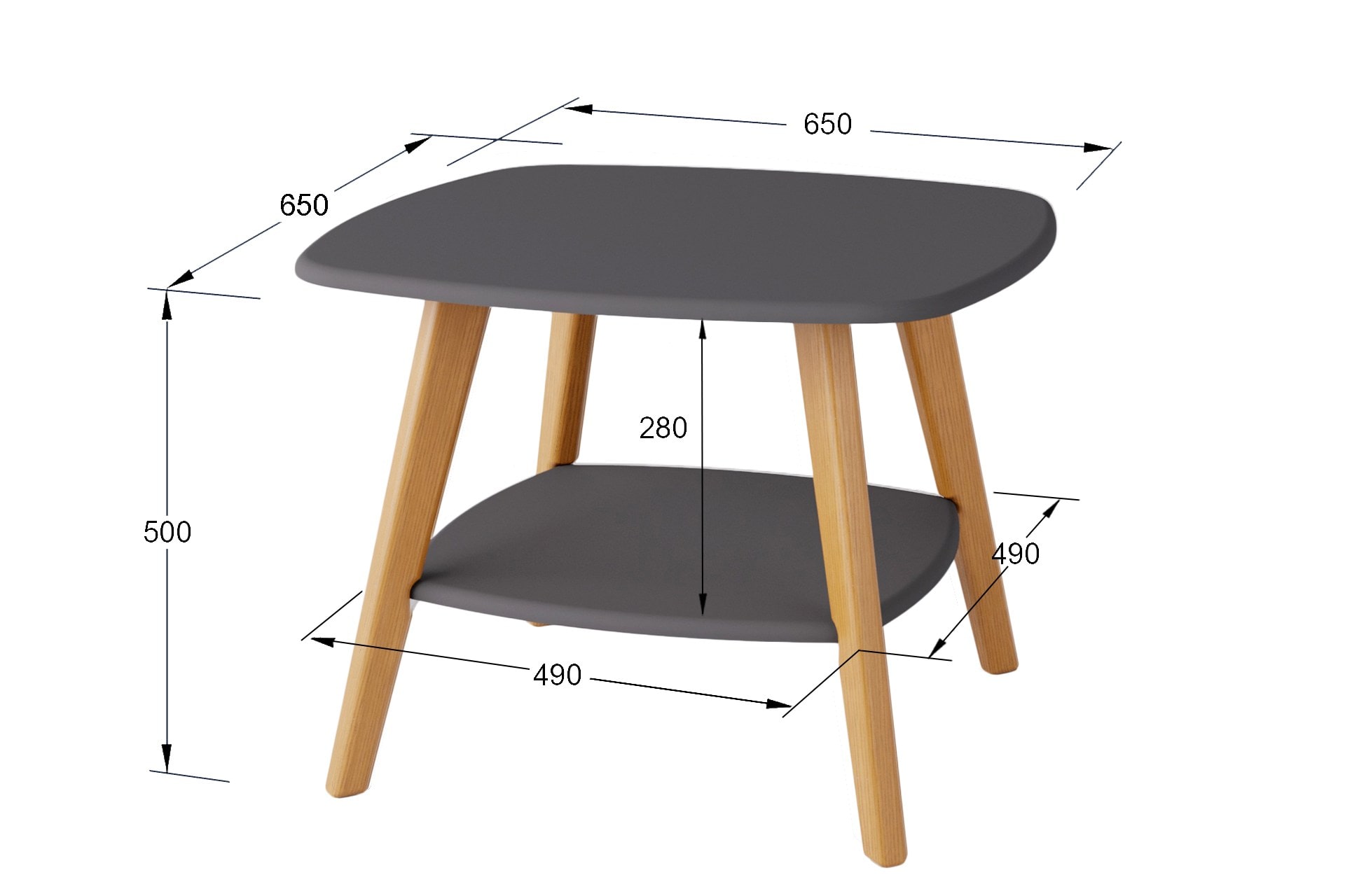 Размер 650х650х500мм. Благодаря квадратной форме столешницы, полки и компактным размерам, стол безупречно дополнит интерьер гостиной или офиса. Максимальная нагрузка до 30 кг