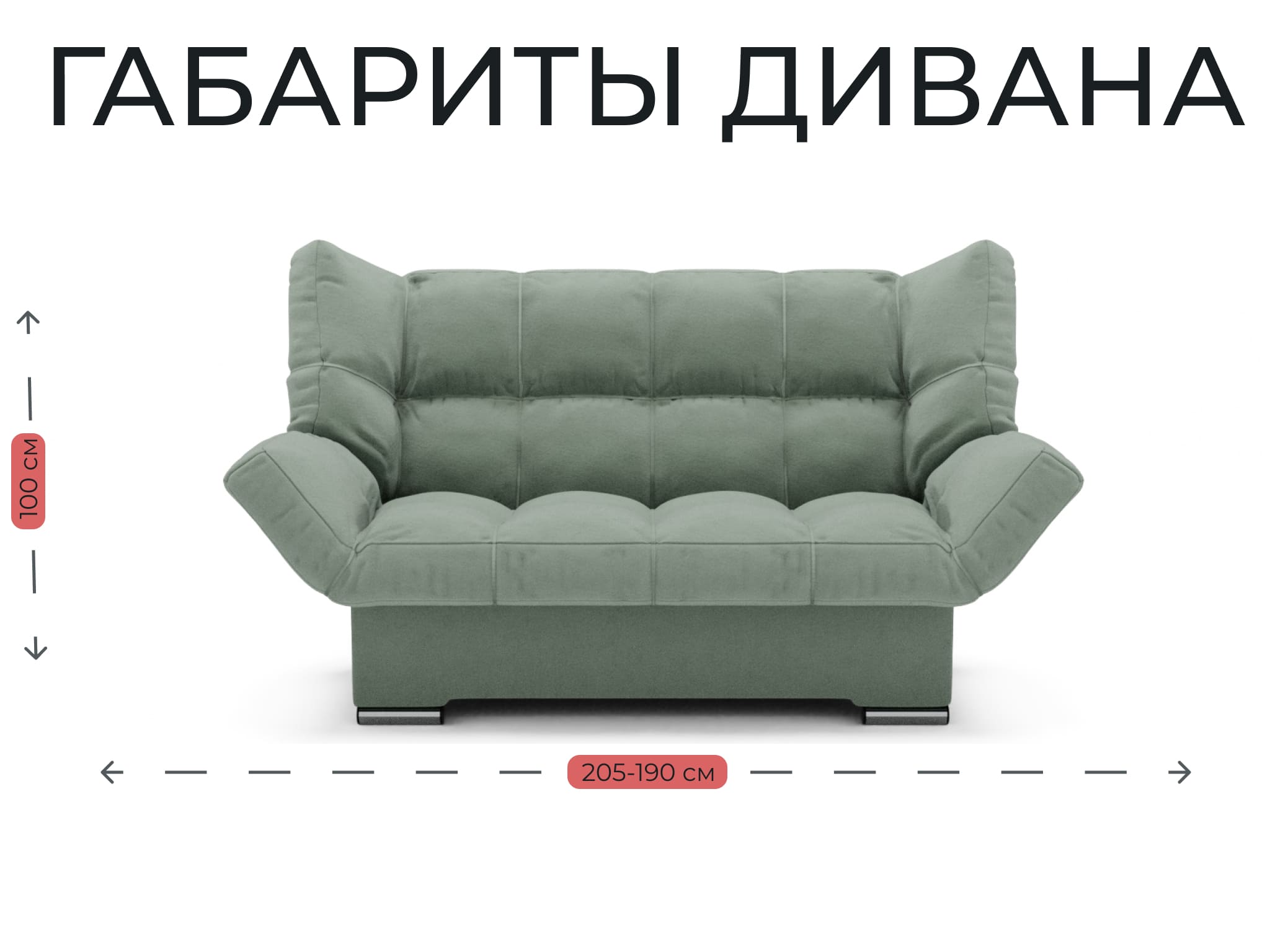 Размеры: длина -205-190см. высота - 100 см, ширина - 100 см. Обивка выполнена из текстиля, цвет фисташковый. Глубина сиденья - 65 см, длина спального места - 205 см. Глубина дивана - 100 см, максимальная нагрузка - 220 кг.